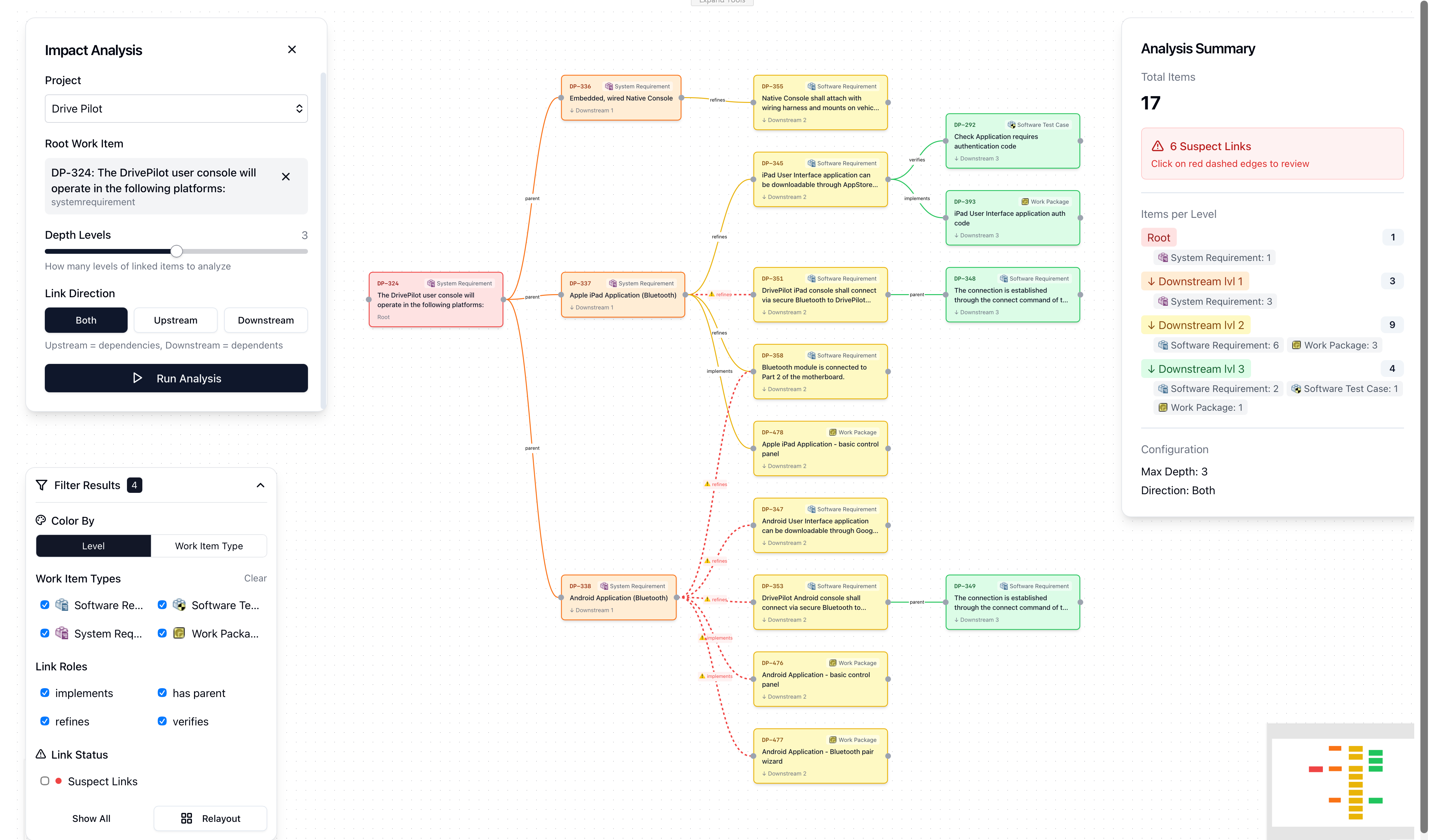 Color-coded visualization makes it easy to distinguish between requirement levels, work item types, and dependency depths. Complex networks become readable in seconds.