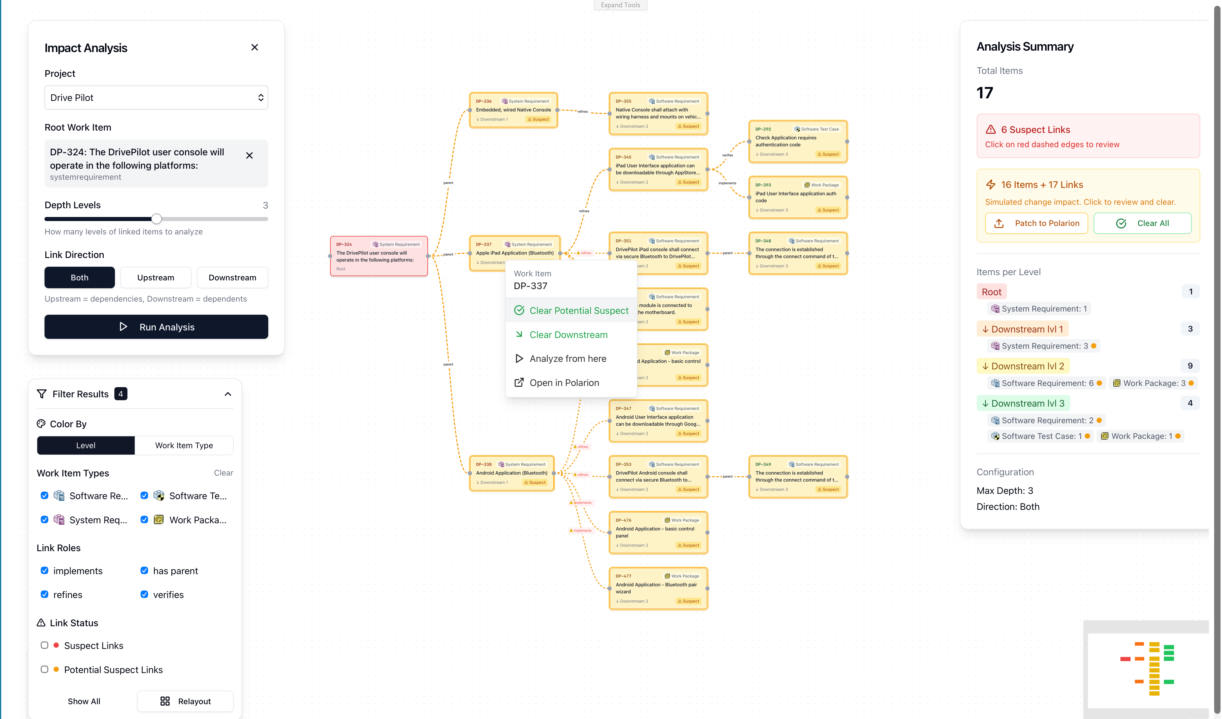 See what would be affected before making any changes. Run an impact analysis, review the results, and only apply suspect flags to Polarion when you are ready — keeping your data safe until you decide to act.