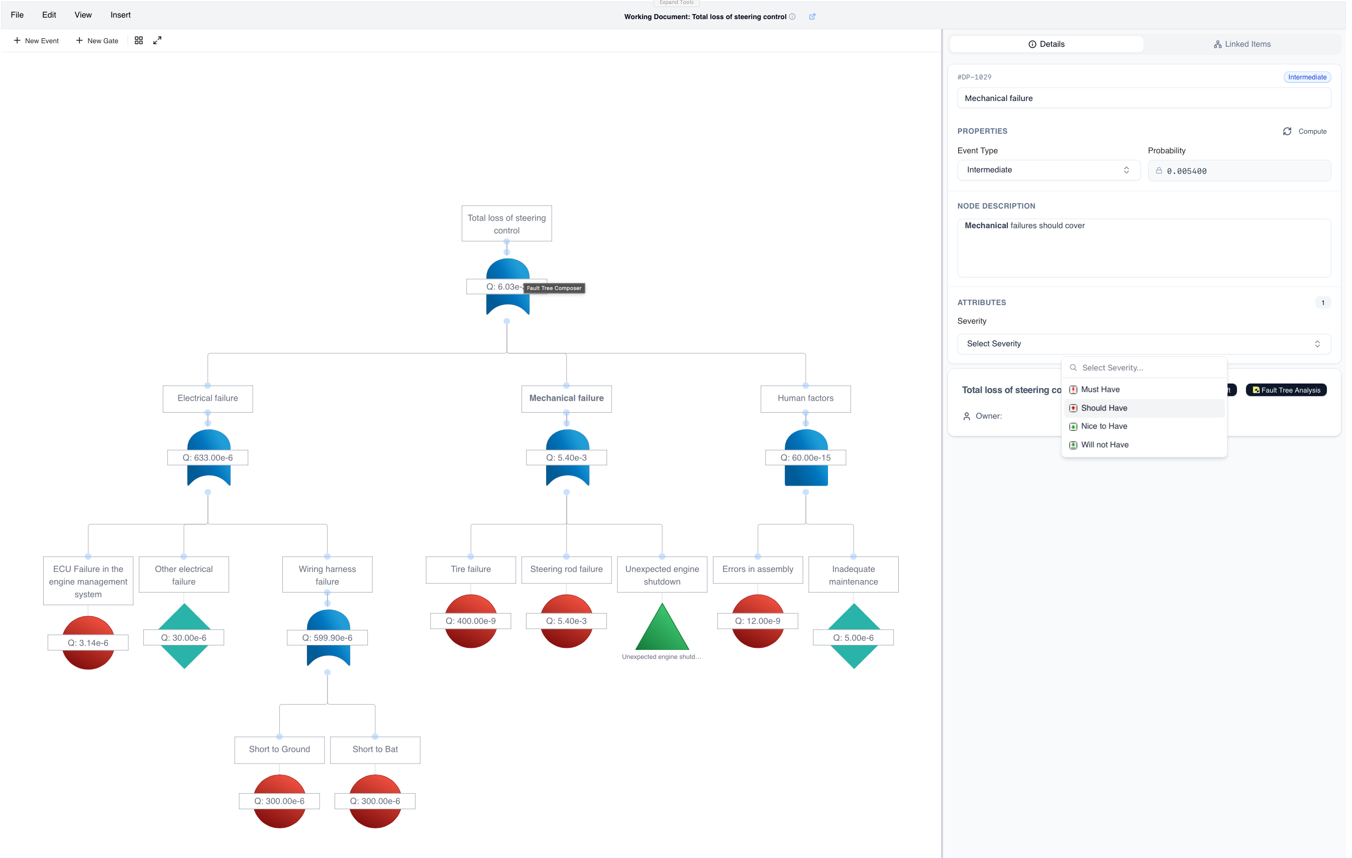 Automatic probability assessment across the entire fault tree structure — no separate calculators, no spreadsheets. Every gate and event contributes to a live, end-to-end probability rollup.
