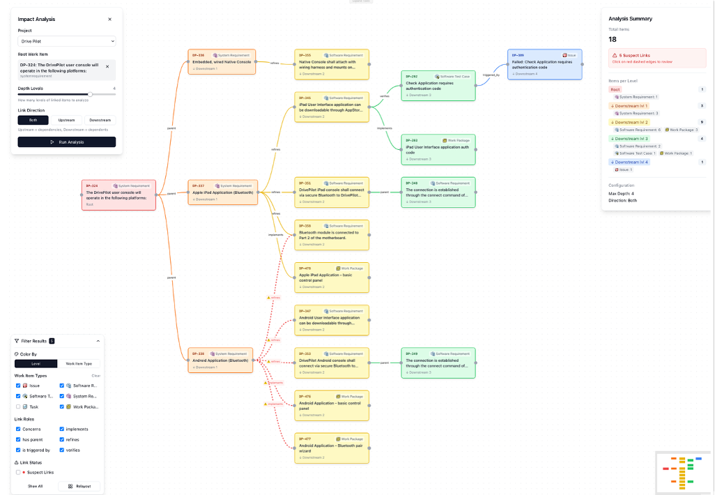 For safety-critical industries (automotive, aerospace, medical devices), demonstrate complete impact analysis as part of your compliance documentation. Every analysis is performed within Polarion's auditable environment.